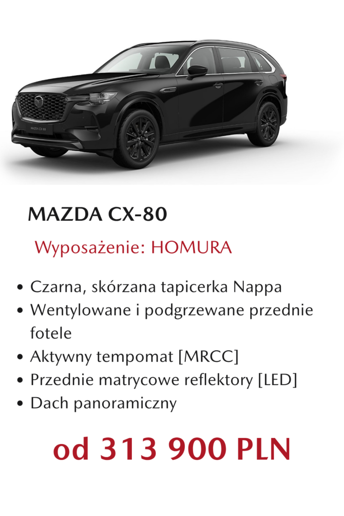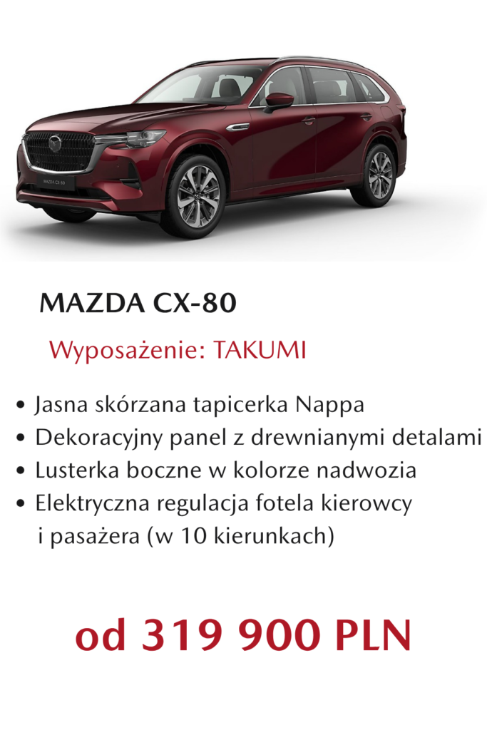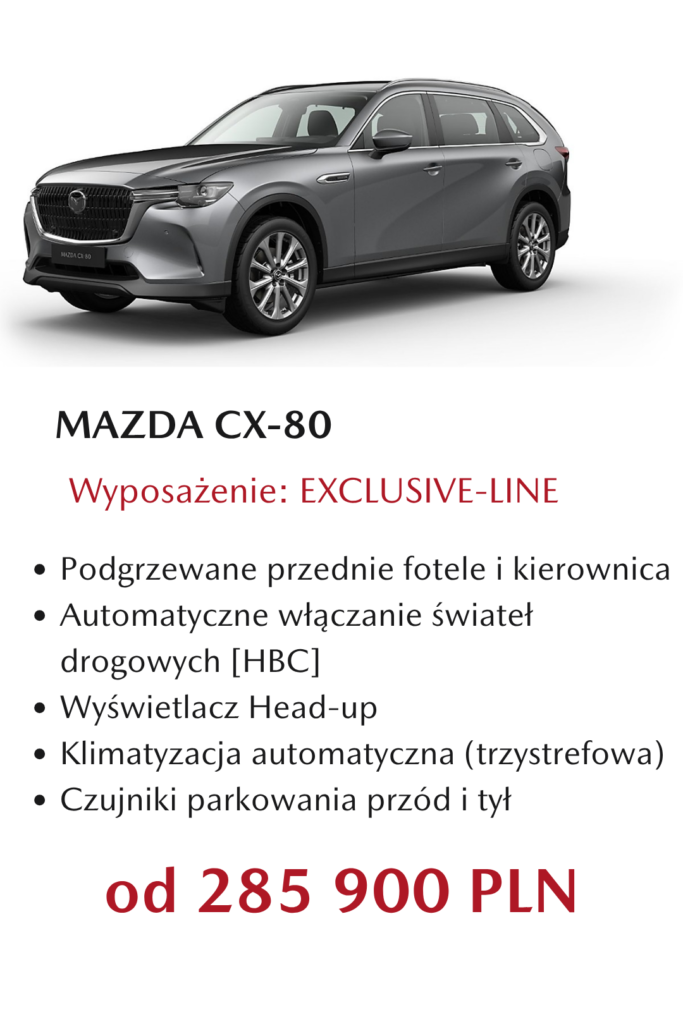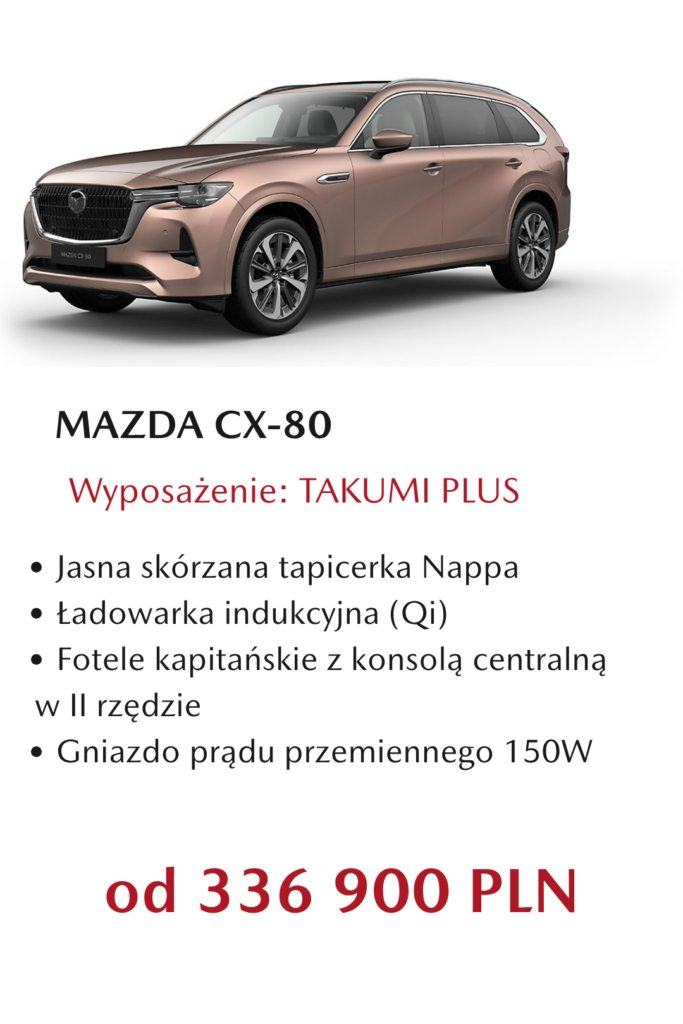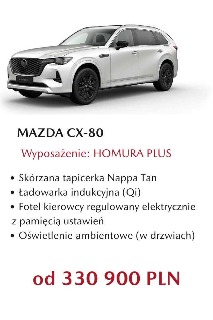Mazda CX-80 to harmonijne połączenie rozmiaru, elegancji i nowoczesnych technologii. Ten trzyrzędowy SUV klasy premium – dostępny nawet w układzie siedzeń dla 6 lub 7 pasażerów – oferuje imponującą przestrzeń, komfort jazdy i napęd odpowiadający wymaganiom współczesnych rodzin. Stworzony z pasją japońskich mistrzów, CX-80 prezentuje efektowną sylwetkę na zewnątrz i dopracowane wnętrze – gotowe, by zamienić każdą trasę w prawdziwą przyjemność jazdy.